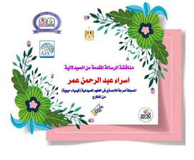 مناقشة الرسالة المقدمة من الصيدلانية / اسراء عبد الرحمن عمر- المسجلة لدرجة الماجستير فى العلوم الصيدلية (كيمياء حيوية) من الخارج 8 فبراير 2024