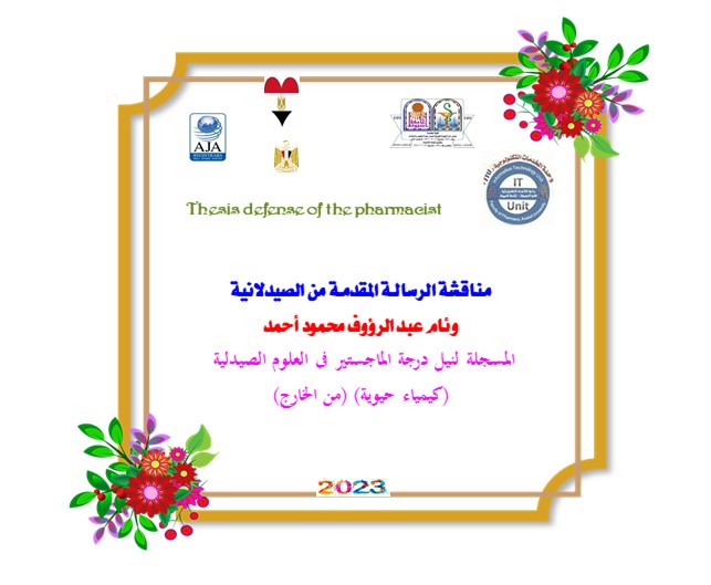 مناقشة الرسالة المقدمة من الصيدلانية/ وئام عبد الرؤوف محمود أحمد - المسجلة لنيل درجة الماجستير في العلوم الصيدلية (كيمياء حيوية)من الخارج - يوم الأحد الموافق18 يونيو2023