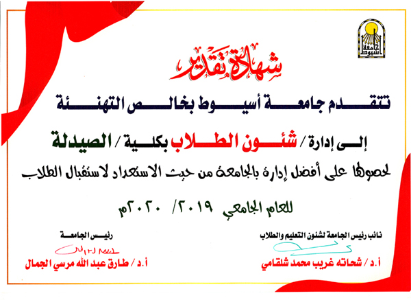 عميد كلية الصيدلة وأسرة الكلية يقدمون خالص التهنئة لإدارة شئون الطلاب بالكلية لحصولها علي أفضل إدارة بالجامعة من حيث الاستعداد لاستقبال الطلاب للعام الجامعي 2019-2020م.