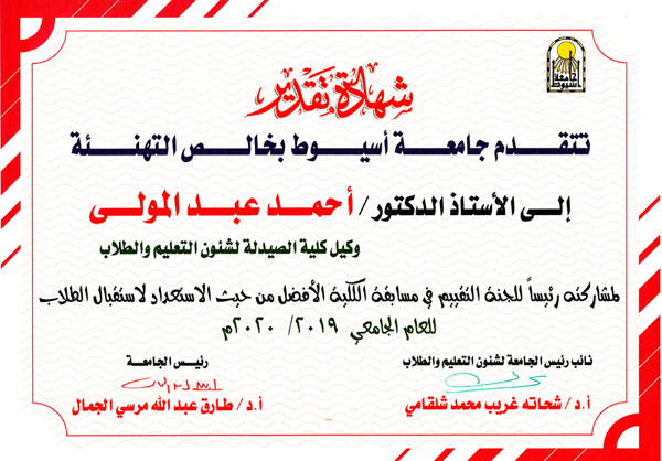 عميد كلية الصيدلة وأسرة الكلية يقدمون خالص التهنئة للسيد الأستاذ الدكتور: أحمد محمد عبد المولي لمشاركته رئيساً للجنة التقييم في مسابقة الكلية الأفضل من حيث الاستعداد لاستقبال الطلاب للعام الجامعي 2019-2020م.