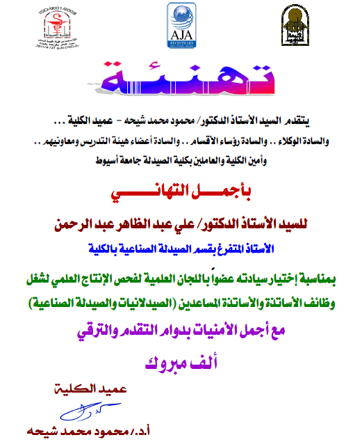 عميد كلية الصيدلة وأسرة الكلية يقدمون خالص التهنئة للسيد الأستاذ الدكتور: علي عبد الظاهر عبد الرحمن بمناسبة إختيار سيادته عضواً باللجان العلمية لفحص الإنتاج العلمي لشغل وظائف الأساتذة والأساتذة المساعدين (الصيدلانيات والصيدلة الصناعية).