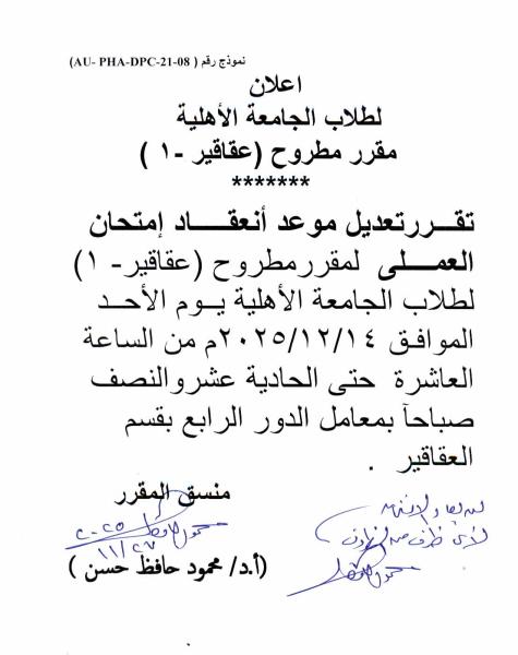 تعديل موعد امتحان العملى لطلاب الجامعة الأهلية مقرر مطروح (عقاقير – 1) الى يوم الأحد 14 ديسمبر 2025 27 نوفمبر 2025