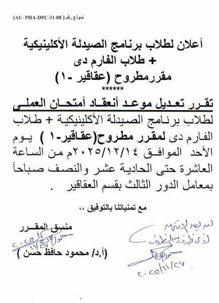 تعديل موعد امتحان العملى لطلاب الصيدلة الاكلينيكية و طلاب الفارم دى مقرر مطروح (عقاقير – 1) الى يوم الأحد 14 ديسمبر 2025 27 نوفمبر 2025