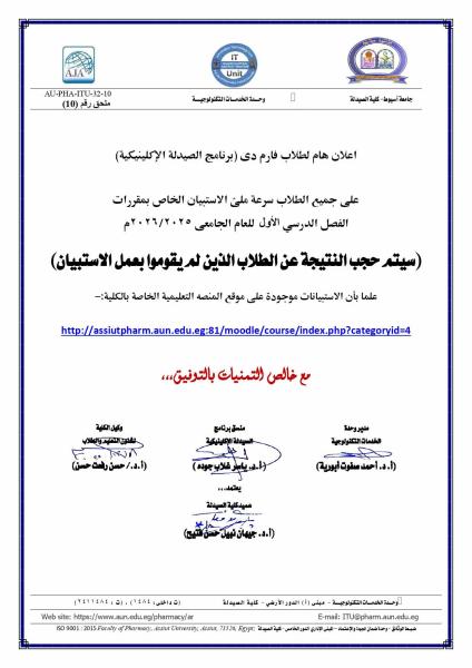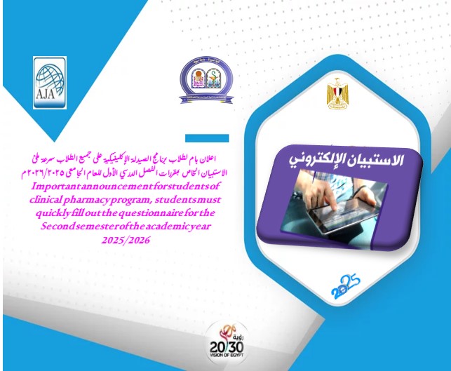 اعلان هام لطلاب برنامج بكالوريوس الصيدلة فارم دى (صيدلة اكلينيكل) على جميع الطلاب سرعة ملئ الاستبيان الخاص بمقررات الفصل الدرسي الأول للعام الجامعى 2026/2025م