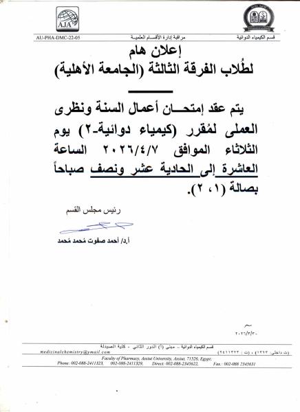 إعلان هام لطلاب الفرقة الثالثة (الجامعة الأهلية) عقد إمتحان أعمال السنة ونظرى العملى لمقرر (كيمياء دوائية-2) يوم الثلاثاء الموافق 7 ابريل 2026 3 أبريل 2026