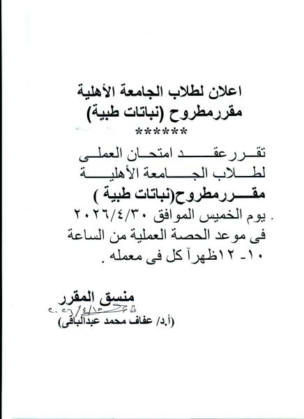 إعلان لطلاب الجامعة الأهلية عقد امتحان العملي لمقرر مطروح (نباتات طبية) يوم الخميس 30 ابريل 2026 16 أبريل 2026