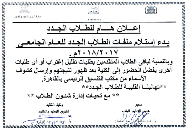 سوف يعقد بمشيئة الله تعالي اجتماع لجنة شئون التعليم والطلاب بكلية الصيدلة يوم الخميس الموافق 10-8-2017م الساعة العاشرة صباحاً بمكتب السيد الأستاذ الدكتور/ وكيل الكلية لشئون التعليم والطلاب.