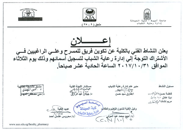 وجه السيد الأستاذ الدكتور / محروس عثمان أحمد -عميد كلية الصيدلة- جامعة أسيوط بتخصيص دقيقة من اجتماع مجلس الكلية وكذلك المحاضرات الدراسية للوقوف حدادا وترحما علي أروح شهداء الوطن من ضباط وجنود الشرطة الذين استشهدوا يوم الجمعة خلال مطاردتهم لبعض العناصر الإرهابية في الكيلو 135 بالواحات البحرية.