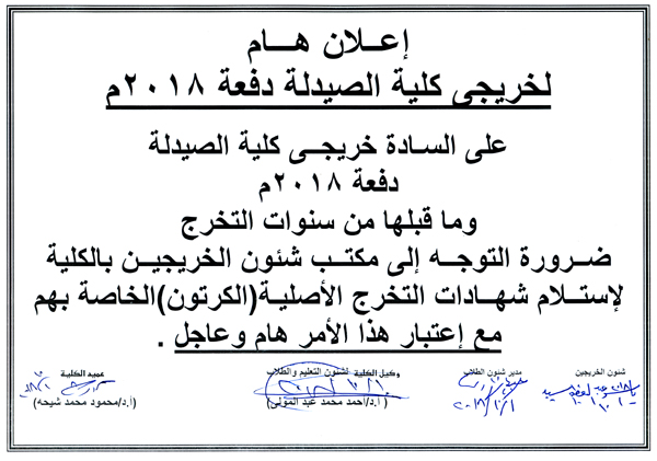 سوف يعقد بمشيئة الله تعالي اجتماع لجنة شئون التعليم والطلاب بكلية الصيدلة يوم الخميس الموافق 11-10-2018م الساعة العاشرة صباحاً بمكتب السيد الأستاذ الدكتور/ وكيل الكلية لشئون التعليم والطلاب.