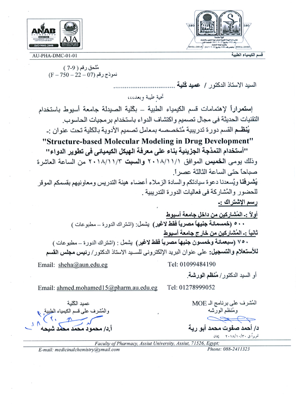 دورة تدريبية متخصصة ينظمها قسم الكيمياء الطبية بعنوان "استخدام النمذجة الجزيئية بناء علي معرفة الهيكل الكيميائي في تطوير الدواء" وذلك يومي الخميس الموافق 1-11-2018 والسبت 3-11-2018م.