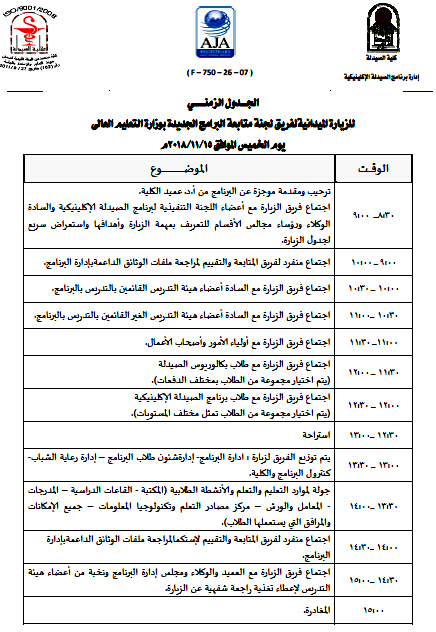 - سوف يعقد بمشيئة الله تعالي اجتماع اللجنة التنفيذية لبرنامج الصيدلة الإكلينيكية يوم الأحد الموافق 11-11-2018م ، الساعة العاشرة صباحاً وذلك بدعوة من السيد الأستاذ الدكتور/ محمود محمد شيحه – عميد كلية الصيدلة ورئيس البرنامج.