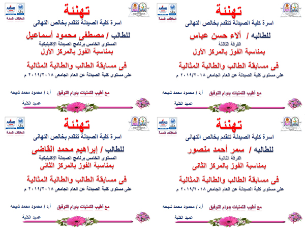 أسرة كلية الصيدلة تهنئ الطالب المثالي والطالبة المثالية الحاصلين علي المركزين الأول والثاني علي مستوي الكلية.