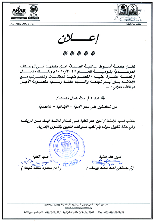 وذلك في تمام الساعة الحادية عشر صباح يوم الاثنين الموافق 14/10/2019م بمدرج الشرح بالدور الثالث بقسم الصيدلانيات بالكلية.