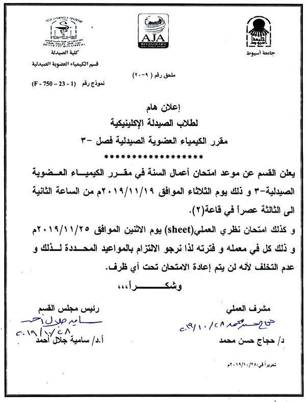 سوف يعقد بمشيئة الله تعالي اجتماع مجلس قسم الكيمياء العضوية الصيدلية بكلية الصيدلة رقم (407) وذلك يوم الاثنين الموافق 4-11-2019م الساعة الحادية عشر والنصف صباحاً بقاعة اجتماعات مجلس القسم.