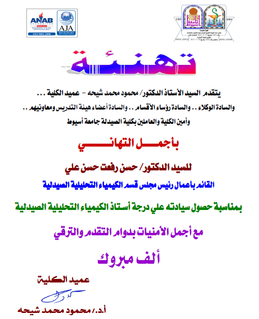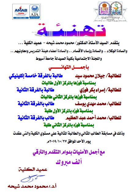 وذلك في تمام الساعة الحادية عشر صباح يوم الاثنين الموافق 4/11/2019م بمدرج الشرح بالدور الثالث بقسم الصيدلانيات بالكلية.