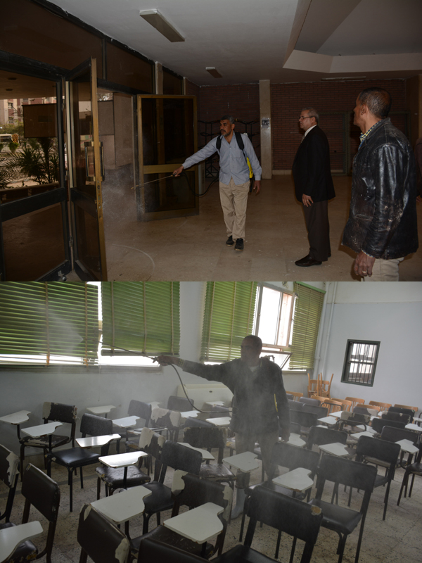 تحت رعاية السيد الأستاذ الدكتور/ طارق عبدلله الجمال – رئيس الجامعة ، وبناءاً على توجيهات مجلس الوزراء والمجلس الأعلى للجامعات ، وفى إطار حرص الجامعة على وقاية ابنائها الطلاب من فيروس كورونا ، وتحت إشراف السيد الأستاذ الدكتو / محمود محمد شيحه – عميد الكلية ، والسيد الأستاذ الدكتور/ أحمد محمد عبدالمولى – وكيل الكلية لشئون التعليم والطلاب ، والسيد الأستاذ الدكتور/ محمود البدرى عبدالمطلب – وكيل الكلية لشئون خدمة المجتمع وتنمية البيئة ، حرصت الكلية على تعقيم وتطهير قاعات الشرح والمدرجات والمعامل وكافيتريا الكلية وذلك يوم الأربعاء الموافق 11/3/2020م.