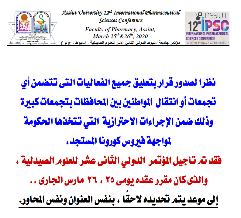 تأجيل المؤتمر الدولي الثاني عشر للعلوم الصيدلية ، والذي كان مقرر عقده يومي ٢٥ ، ٢٦ مارس الجاري .. إلى موعد يتم تحديده لاحقًا ، بنفس العنوان ونفس المحاور.