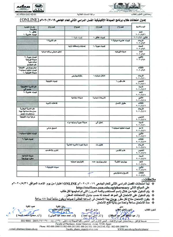 إعلان جدول امتحان طلاب برنامج بكالوريوس الصيدلة (صيدلة إكلينيكية) وبرنامج بكالوريوس الصيدلة (فارم دي) (صيدلة إكلينيكية).