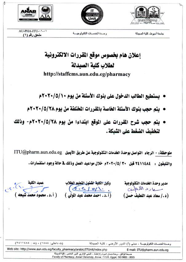 هام لطلاب كلية الصيدلة .. بخصوص المقررات الإلكترونية وبنوك الأسئلة .. موعد الدخول وموعد حجب المقررات وبنوك الأسئلة.
