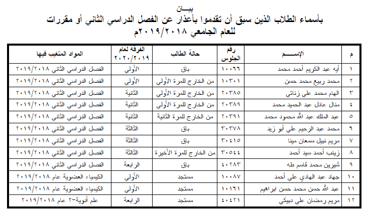 هام لجميع طلاب كلية الصيدلة .. الطلاب الذين تقدموا بأعذار عن الفصل الدراسي الثاني أو مقررات للعام الجامعي 2018-2019م .. ضرورة التواصل مع إدارة شئون الطلاب لتحديد كيفية أداء الإمتحان لهذه المقررات.