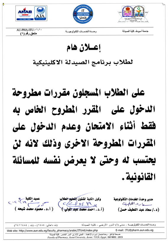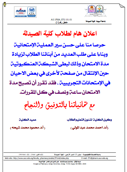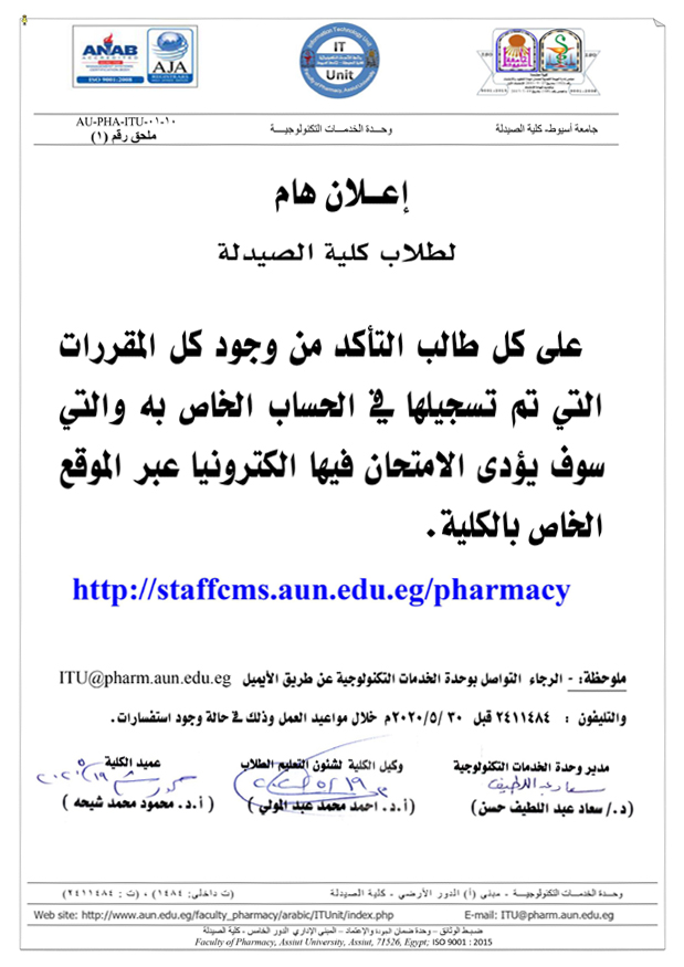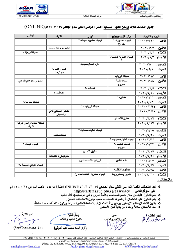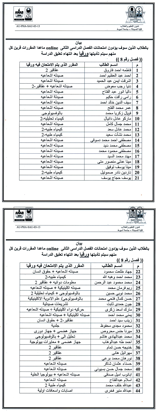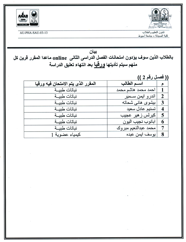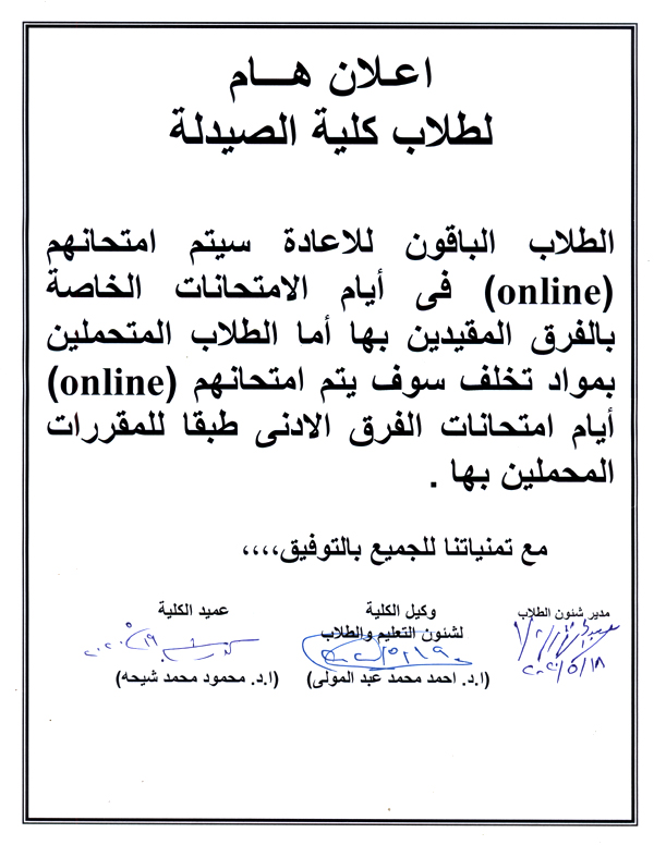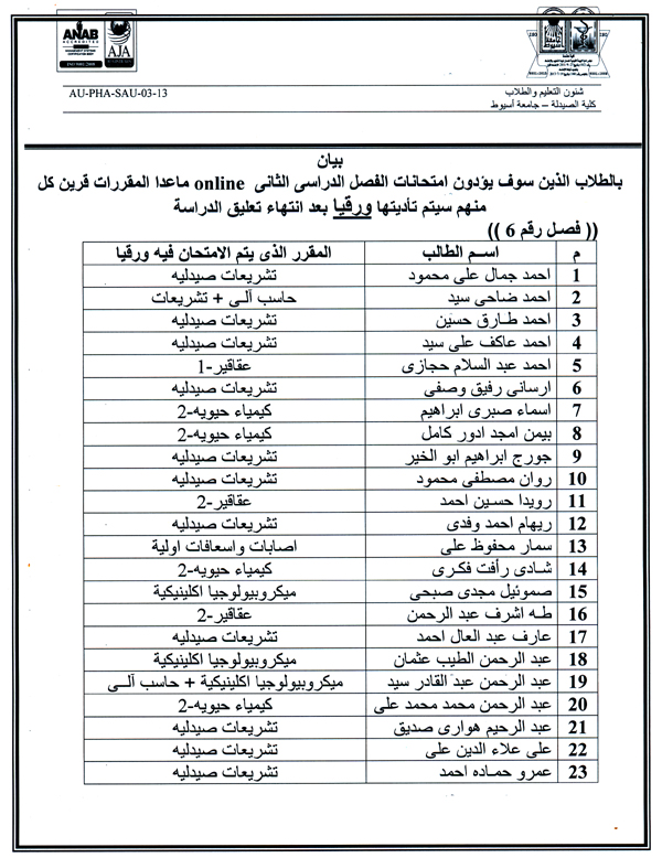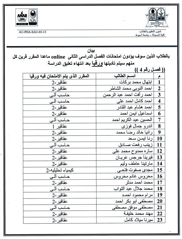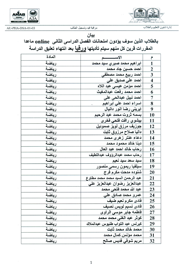 هام لطلاب الفرقة الأولي فارم دي .. بيان بالطلاب الذين سوف يؤدون امتحانات الفصل الدراسي الثاني Online ماعدا المقررات قرين كل منهم سيتم تأديتها ورقيا بعد انتهاء تعليق الدراسة.