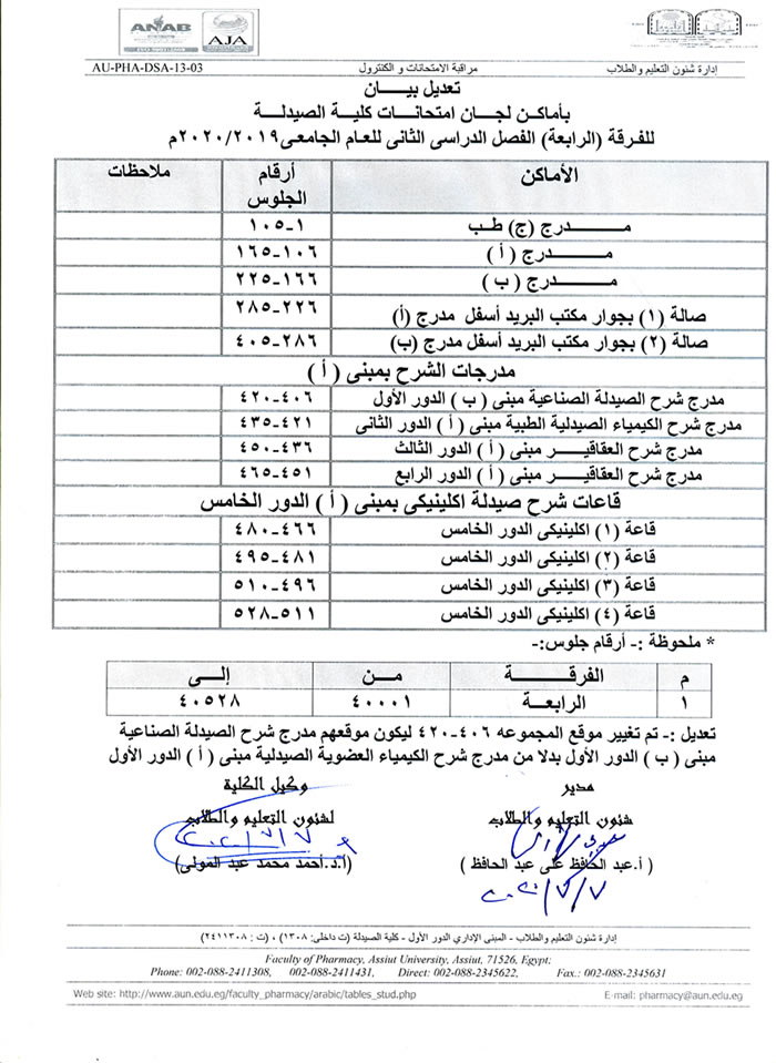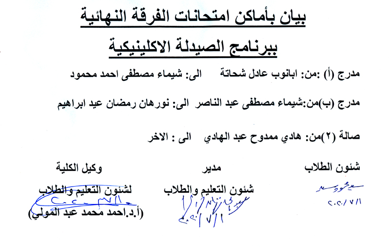 أماكن لجان امتحانات الفرقة النهائية ببرنامج الصيدلة الإكلينيكية الفصل الدراسي الثاني للعام الجامعي 2019-2020م.