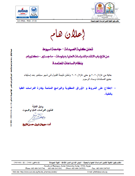 سيتم بإذن الله تعالي عقد حلقة مناقشة علمية لرسالة الدكتوراه الخاصة بالسيد الماجستير: فهد محمد أمين – المدرس المساعد بكلية الصيدلة جامعة الأزهر (فرع أسيوط) - المسجل (من الخارج) لنيل درجة دكتوراه الفلسفة في العلوم الصيدلية (عقاقير) - تحت عنوان: