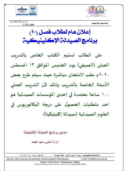 سوف يعقد بمشيئة الله تعالي اجتماع لجنة خدمة المجتمع وتنمية البيئة بكلية الصيدلة يوم الثلاثاء الموافق 11-8-2020م في تمام الساعة العاشرة صباحاً وذلك بمكتب السيد الأستاذ الدكتور/ وكيل الكلية لشئون خدمة المجتمع وتنمية البيئة.
