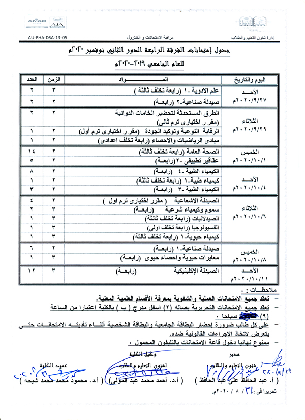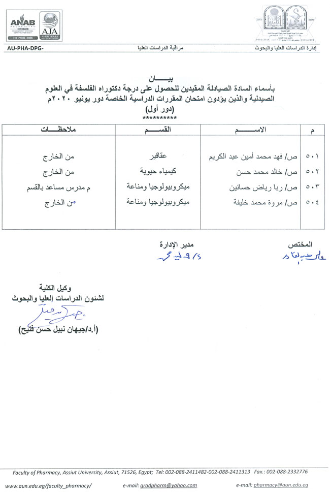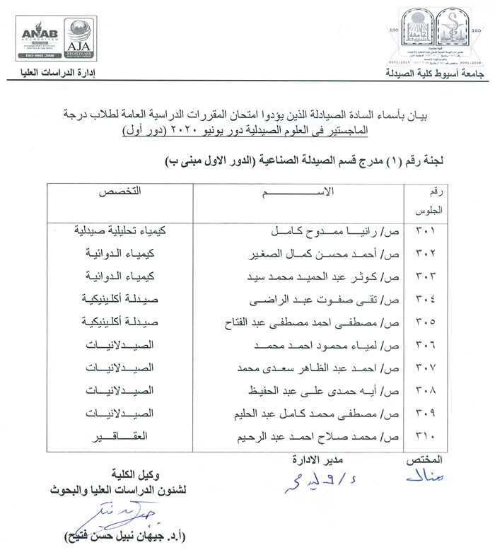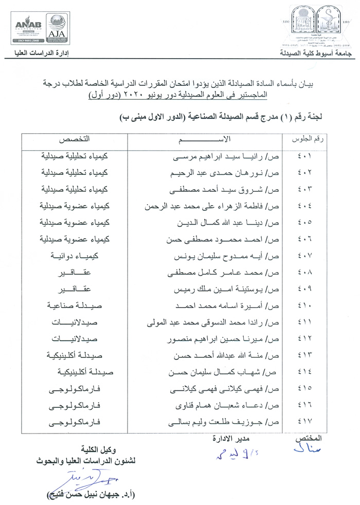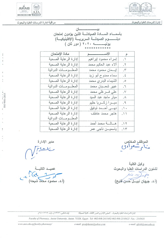 بيان باسماء وارقام جلوس السادة الصيادلة الذين يؤدون امتحان دبلوم الصيدلة الإكلينيكية دور ثان.
