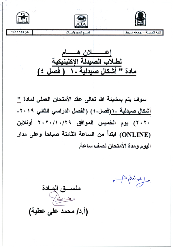 عقد الامتحان العملي مادة "أشكال صيدلية-1" لطلاب فصل 4 (صيدلة إكلينيكية) للفصل الدراسي الثاني من العام الجامعي 2019-2020م يوم الخميس الموافق 29-10-2020م Online.