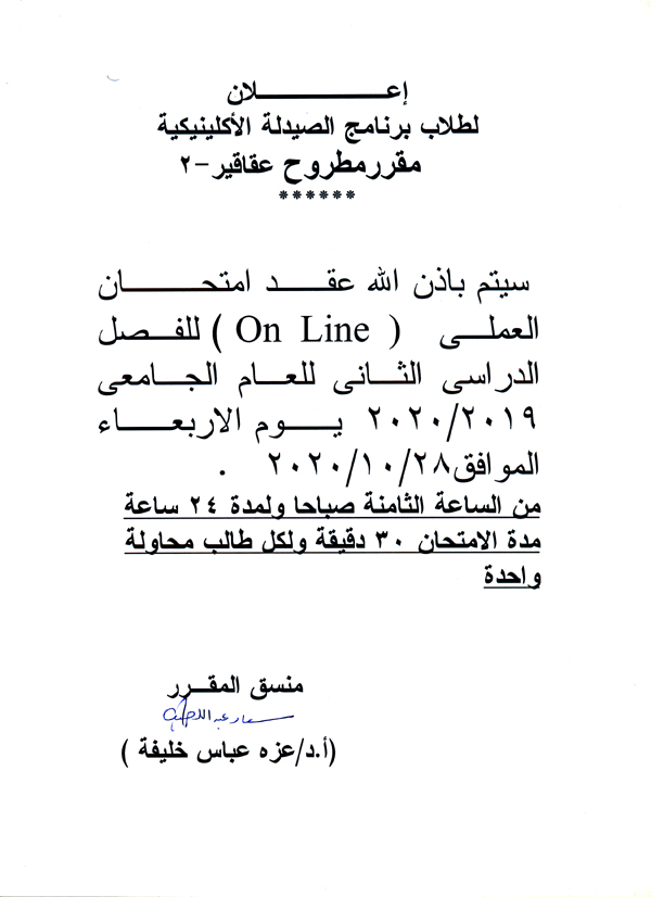 عقد الامتحان العملي مقرر مطروح مادة "عقاقير-2" لطلاب الصيدلة الإكلينيكية للفصل الدراسي الثاني من العام الجامعي 2019-2020م يوم الأربعاء الموافق 28-10-2020م Online.