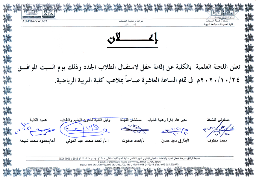 حفل استقبال الطلاب الجدد يوم السبت الموافق 24-10-2020م الساعة العاشرة صباحاً بملاعب كلية التربية الرياضية.