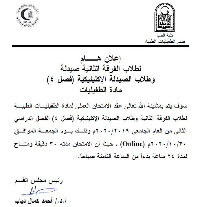 عقد الامتحان العملي مادة "الطفيليات" لطلاب الفرقة الثانية وطلاب فصل 4 (صيدلة إكلينيكية) للفصل الدراسي الثاني من العام الجامعي 2019-2020م يوم الجمعة الموافق 30-10-2020م Online.