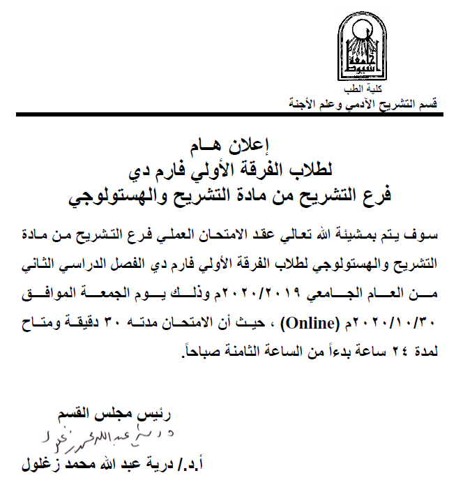 عقد الامتحان العملي فرع التشريح من مادة "التشريح والهستولوجي" لطلاب الفرقة الأولي فارم دي للفصل الدراسي الثاني من العام الجامعي 2019-2020م يوم الجمعة الموافق 30-10-2020م Online.