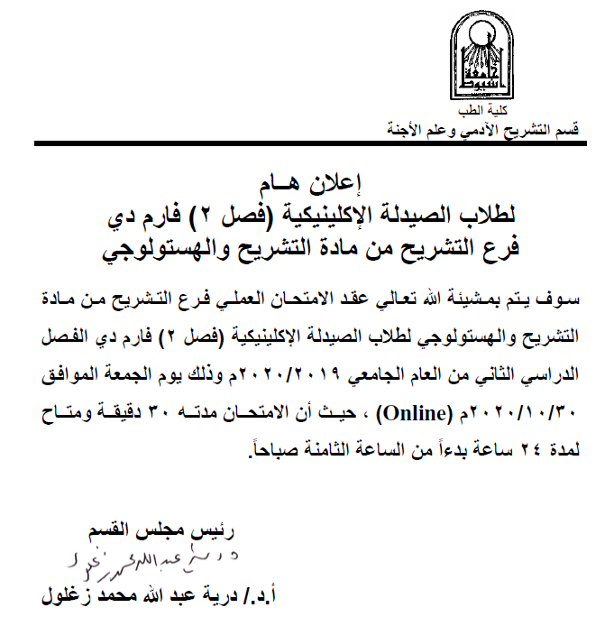 عقد الامتحان العملي فرع التشريح من مادة "التشريح والهستولوجي" لطلاب فصل 2 فارم دي (صيدلة إكلينيكية) للفصل الدراسي الثاني من العام الجامعي 2019-2020م يوم الجمعة الموافق 30-10-2020م Online.