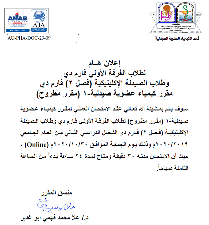 عقد الامتحان العملي مقرر كيمياء عضوية صيدلية-1 (مقرر مطروح) لطلاب الفرقة الأولي فارم دي وطلاب الصيدلة الإكلينيكية (فصل 2) فارم دي للفصل الدراسي الثاني من العام الجامعي 2019-2020م يوم الجمعة الموافق 30-10-2020م Online.