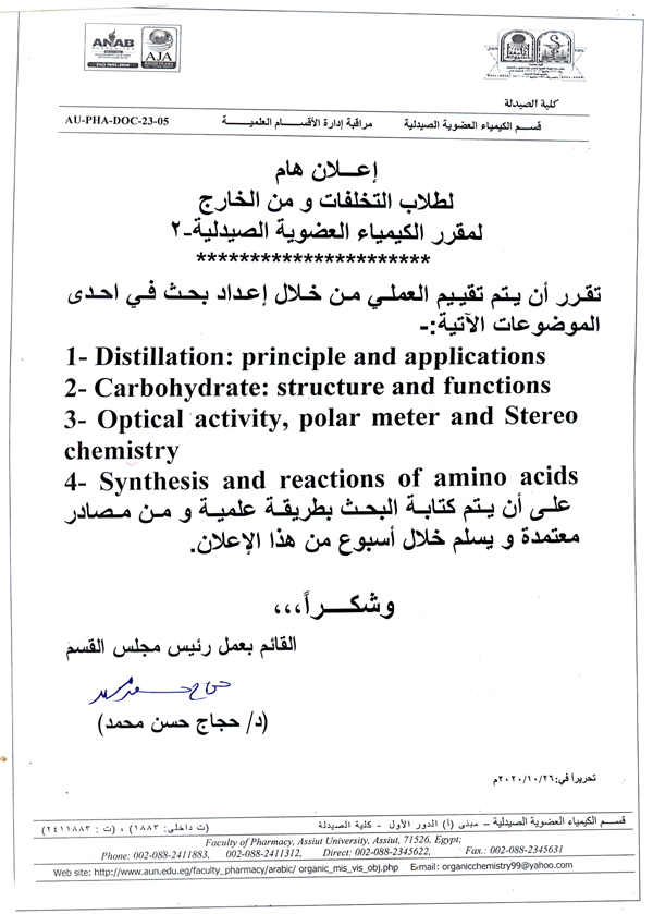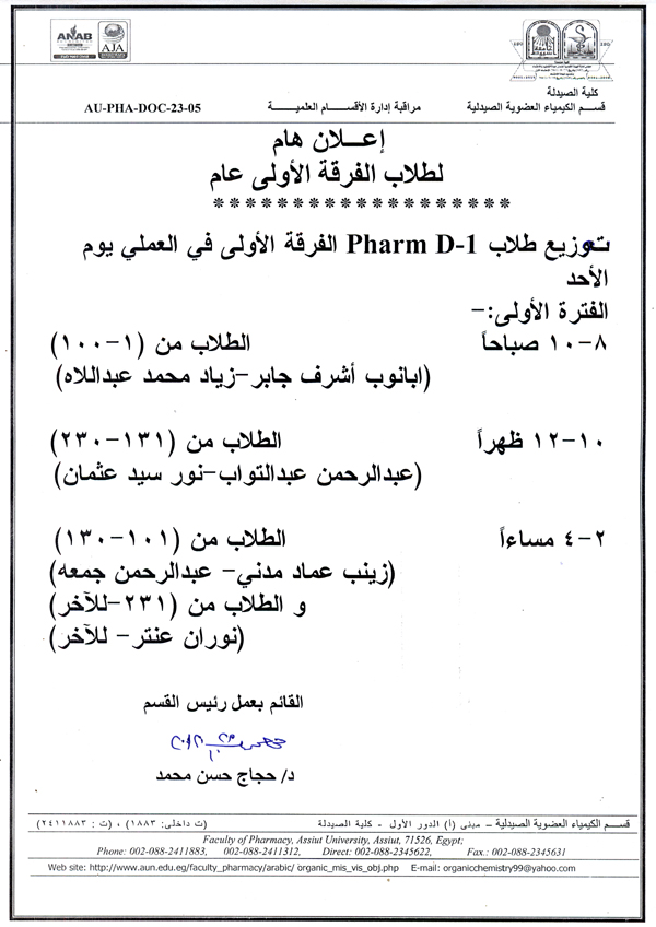 هام لطلاب الفرقة الأولي (فارم دي) .. بشأن توزيع الطلاب علي معامل قسم الكيمياء العضوية الصيدلية للفصل الدراسي الأول من العام الجامعي 2020-2021م.