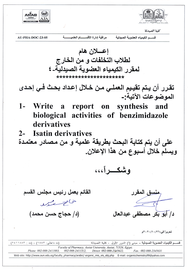وذلك في تمام الساعة الثانية عشر ظهر يوم الأحد الموافق 1-11-2020م بقاعة مجلس قسم الكيمياء العضوية الصيدلية بالدور الأول مبنى (أ) بالكلية.