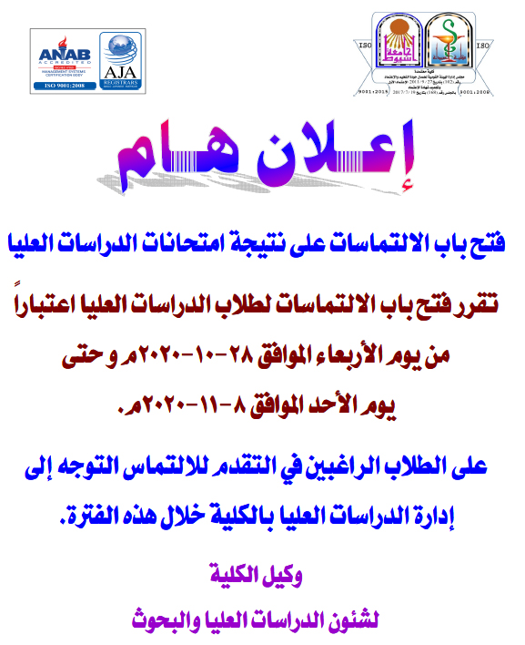 وذلك في تمام الساعة العاشرة صباح يوم الأحد الموافق 1-11-2020م بقاعة مجلس قسم الكيمياء التحليلية الصيدلية بالدور الخامس مبنى (ب) بالكلية.