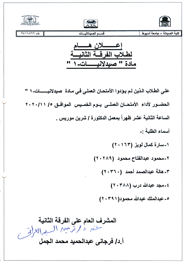 هام لطلاب الفرقة الثانية الذين لم يؤدوا الامتحان العملي لمادة "صيدلانيات-1" .. سيعقد لهم امتحان عملي يوم الخميس الموافق 5-11-2020م بمعمل الدكتورة: شرين موريس الساعة الثانية عشر ظهراً.