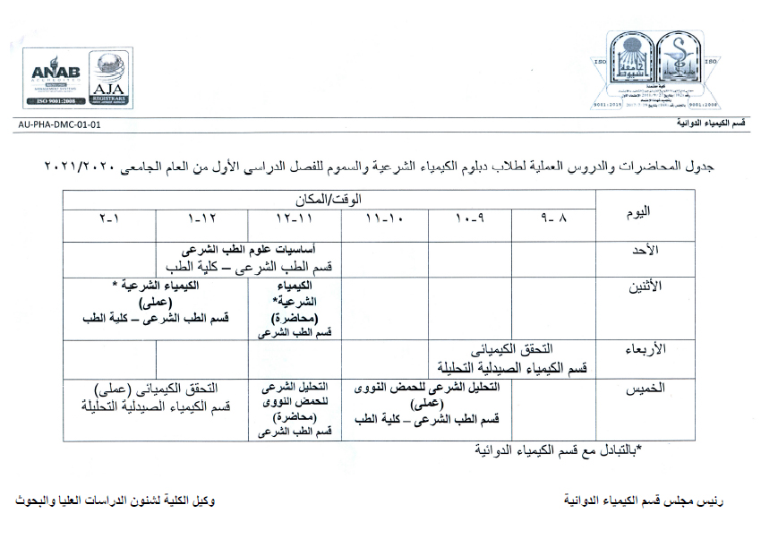 جدول المحاضرات والدروس العملية لطلاب دبلوم الكيمياء الشرعية والسموم للفصل الدراسي الأول من العام الجامعي 2020-2021م.
