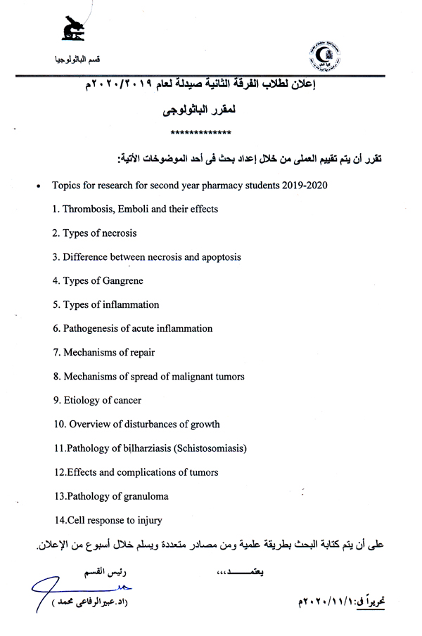 تقييم العملي لمقرر الباثولوجي لطلاب الفرقة الثانية للفصل الدراسي الثاني من العام الجامعي 2019-2020م.