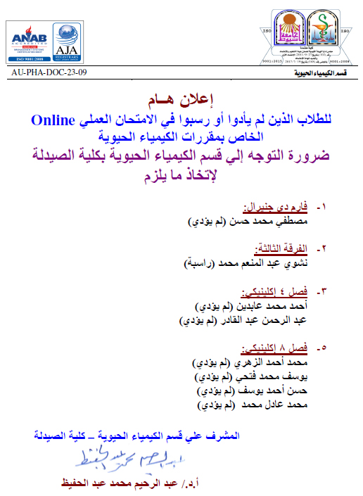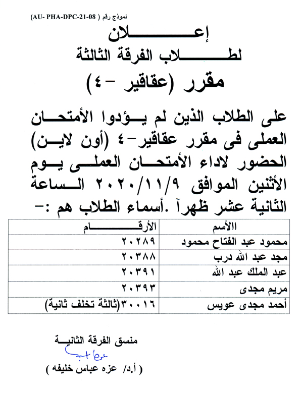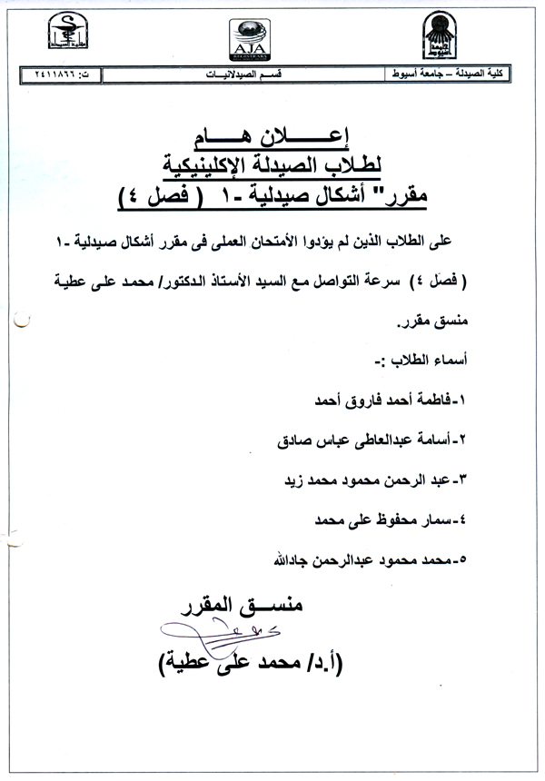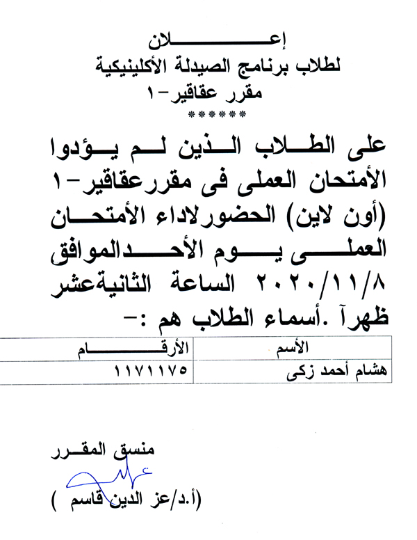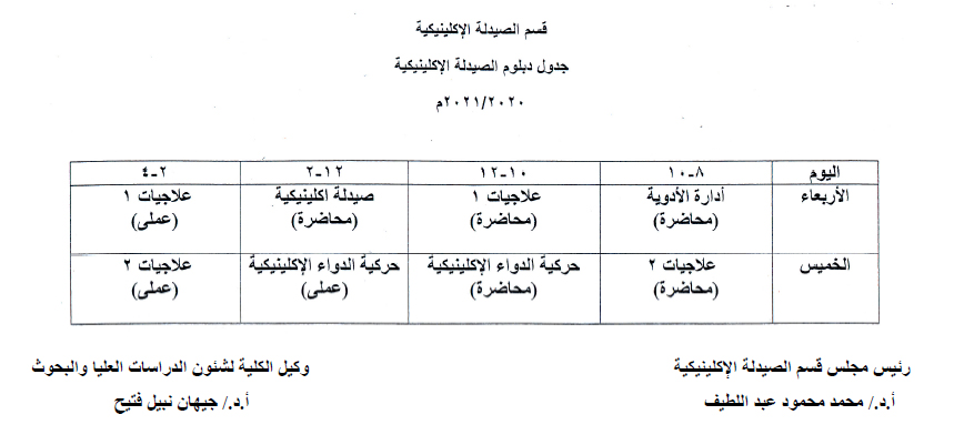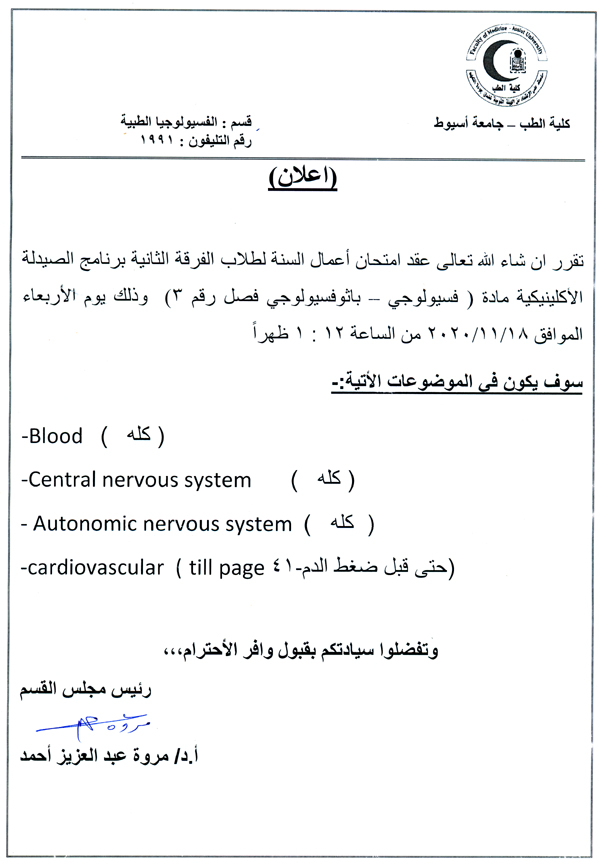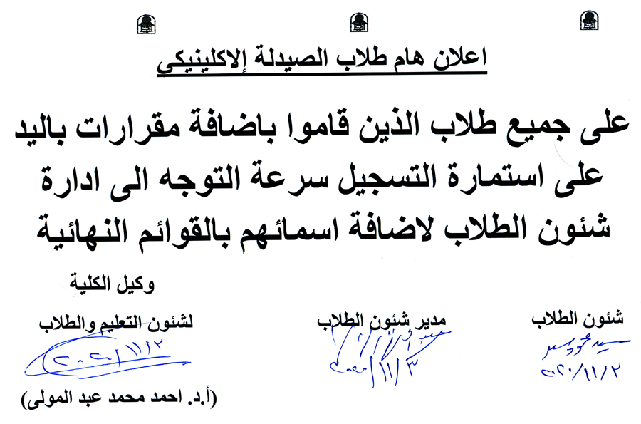 سوف يعقد بمشيئة الله تعالي اجتماع مجلس قسم الكيمياء الدوائية بكلية الصيدلة رقم (432) وذلك يوم الخميس الموافق 5-11-2020م الساعة العاشرة صباحاً بمكتبة القسم.