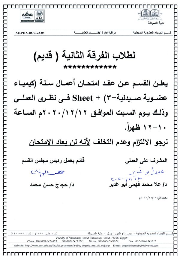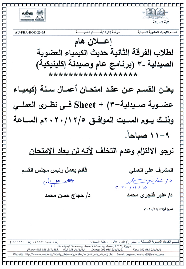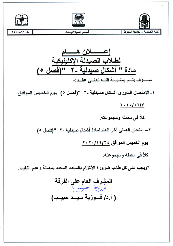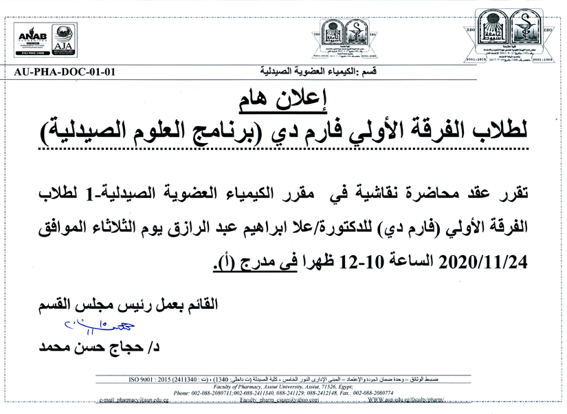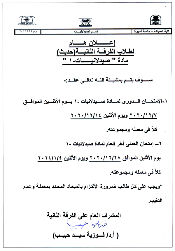 - سوف يعقد بمشيئة الله تعالي اجتماع لجنة المكتبات بكلية الصيدلة يوم الأربعاء الموافق 18-11-2020م ، الساعة الحادية عشر صباحا وذلك بدعوة من السيد الأستاذ الدكتور/ محمود محمد شيحه – عميد كلية الصيدلة ومقرر لجنة المكتبات.