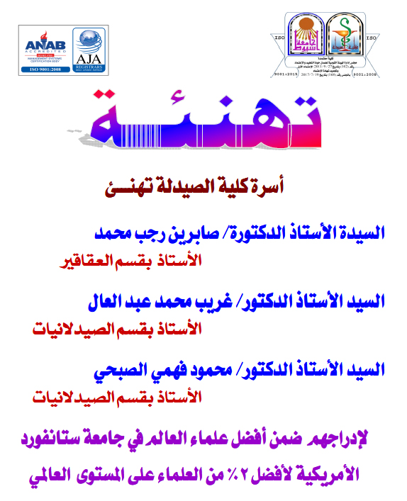 تهنئة لكل من أ.د. صابرين رجب محمد ، أ.د. غريب محمد عبد العال ، أ.د. محمود فهمي الصبحي لإدراجهم ضمن أفضل علماء العالم في جامعة ستانفورد الأمريكية لأفضل 2% من العلماء على المستوى العالمي.