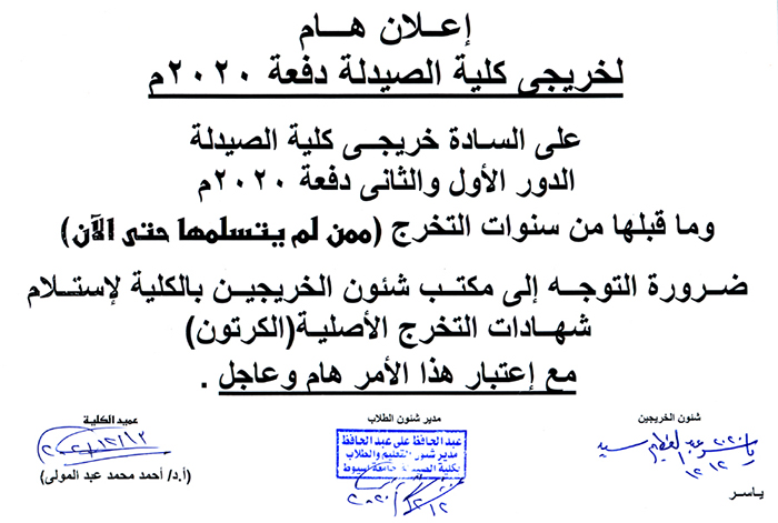 هام لخريجي كلية الصيدلة الدور الأول والثاني دفعة 2020م وما قبلها .. ضرورة استلام الشهادة الأصلية (الكرتون).