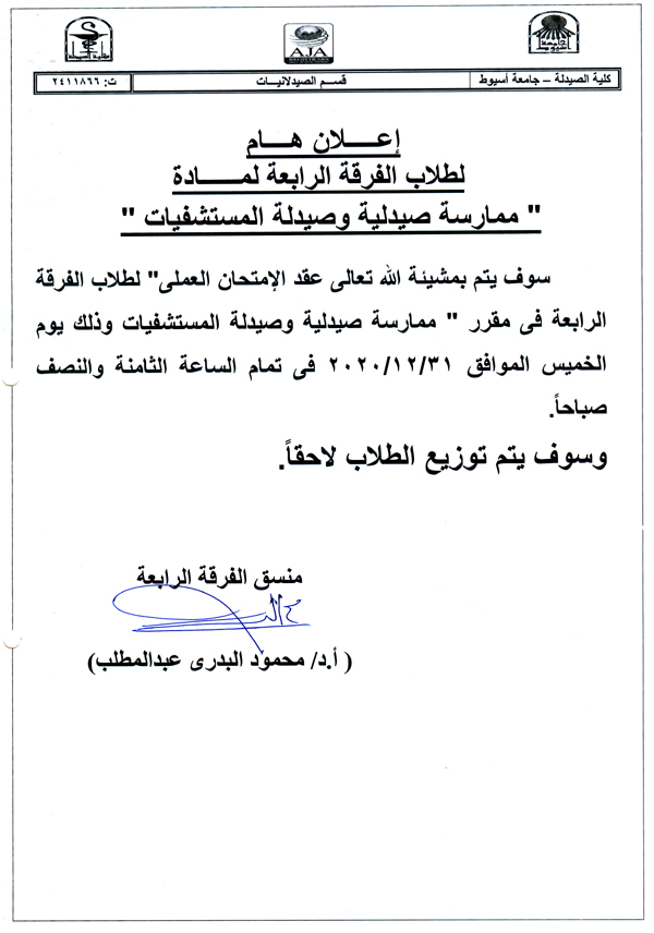 هام لطلاب الفرقة الرابعة .. عقد الامتحان العملي لمقرر "ممارسة صيدلية وصيدلة المستشفيات" يوم الخميس الموافق 31-12-2020م.