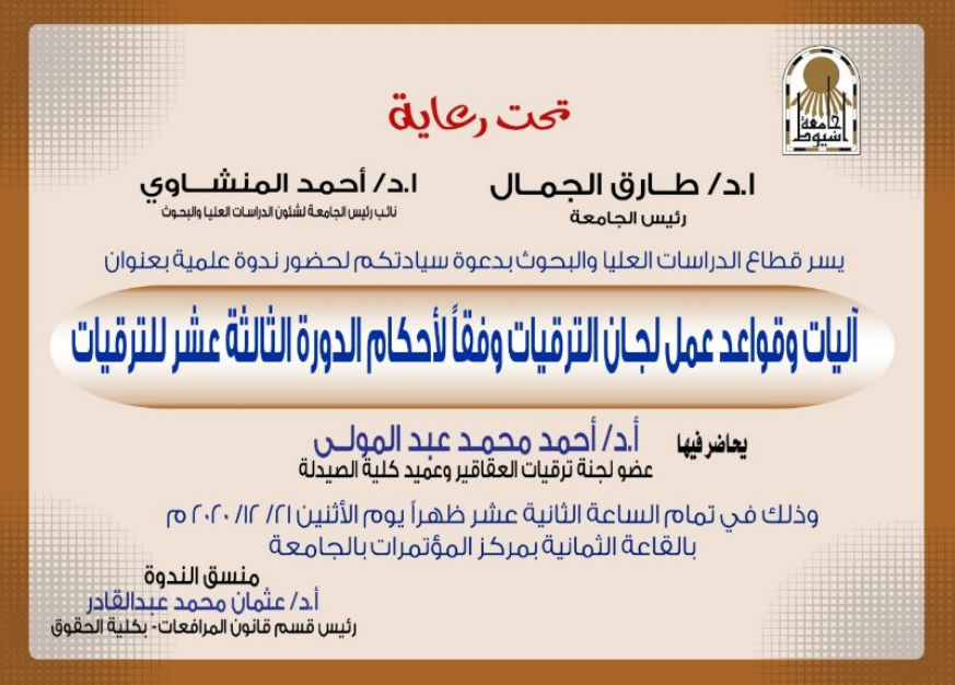 دعوة لحضور ندوة بعنوان آليات وقواعد عمل لجان الترقيات وفقا لأحكام الدورة 13 للترقيات .. يحاضر فيها الأستاذ الدكتور: أحمد محمد عبد المولي – عميد كلية الصيدلة وعضو لجنة ترقيات العقاقير يوم الاثنين الموافق 21-12-2020م.