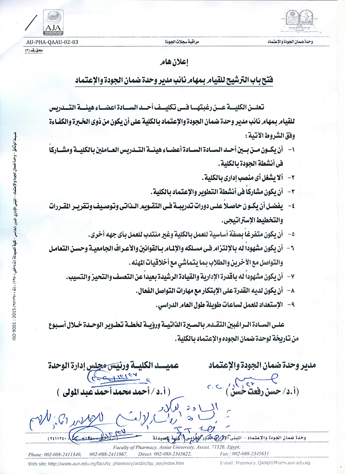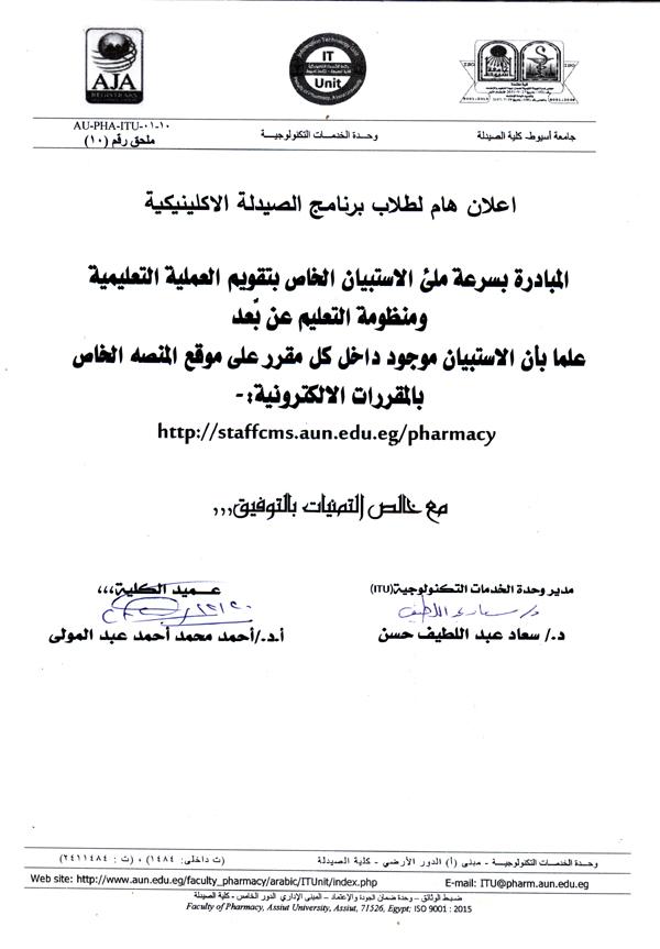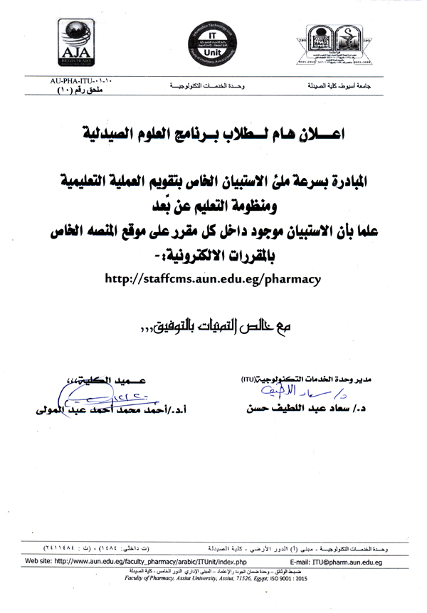 هام لطلاب برنامج الصيدلة الإكلينيكية .. سرعة ملء الاستبيان الخاص بتقويم العملية التعليمية ومنظومة التعليم عن بعد .. الاستبيان موجود داخل كل مقرر علي موقع المنصة الخاص بالمقررات الالكترونية.