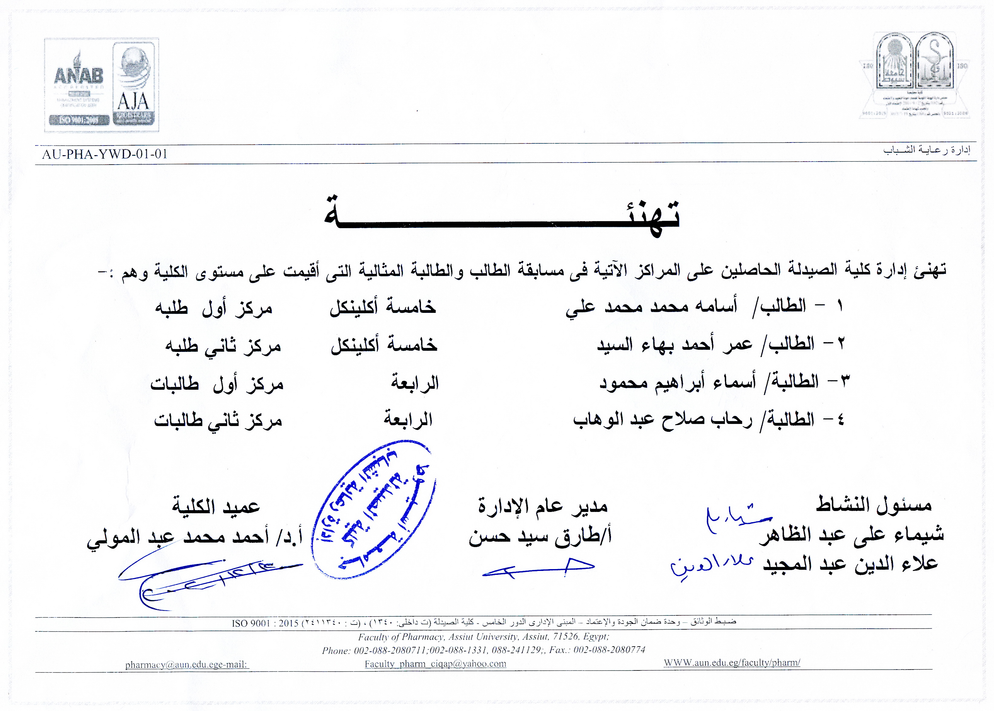 تهنئة للطلاب الحاصلين علي مراكز في مسابقة الطالب والطالبة المثالية علي مستوي الكلية.